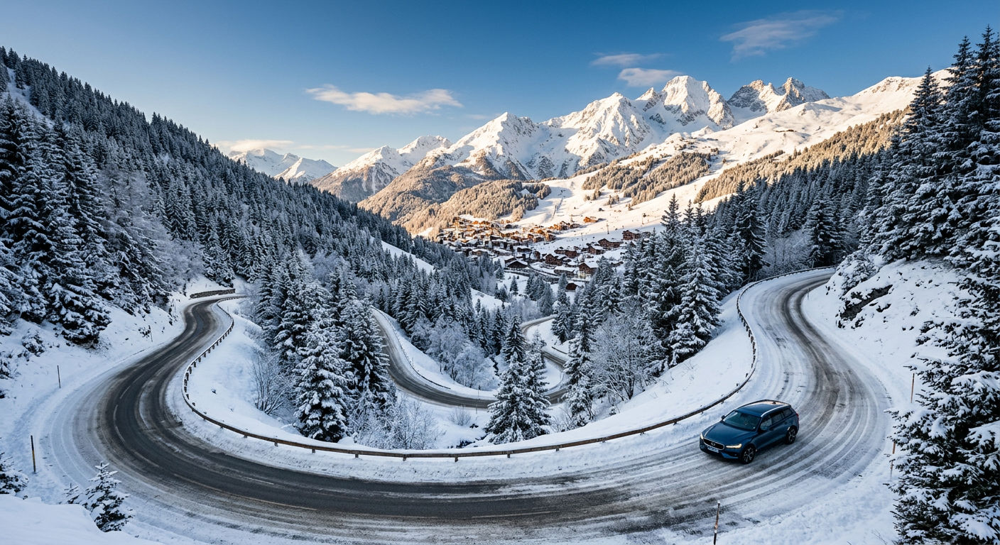 The transfer from Geneva Airport to Méribel takes approximately 2.5–3 hours by road. Private transfer services, shared shuttles, and rental cars are all available. The route crosses the Swiss-French border and follows the A40 and A43 motorways before climbing the Tarentaise Valley to Moûtiers, then the D90 mountain road to Méribel. Saturday arrivals coincide with peak changeover traffic — Sunday transfers are typically 30–45 minutes faster.